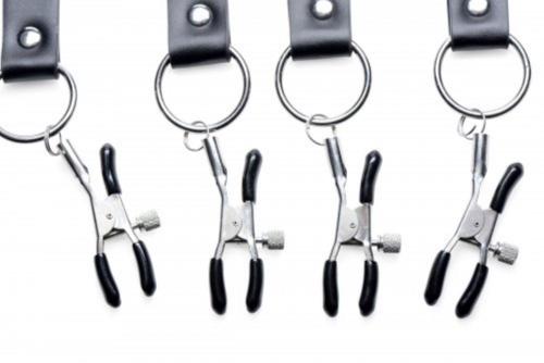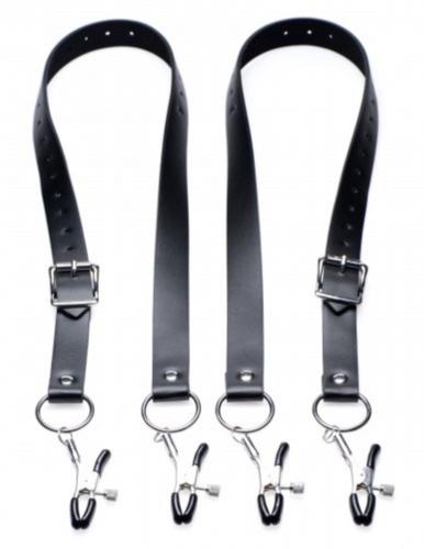 Labia Spreader er skemmtileg vara frá Master Series. Stillanlegar ólarnar fara utan um lærin með áföstum klemmum til að festa á ytri barmana. Hægt er að herða og leysa klemmurnar að vild.