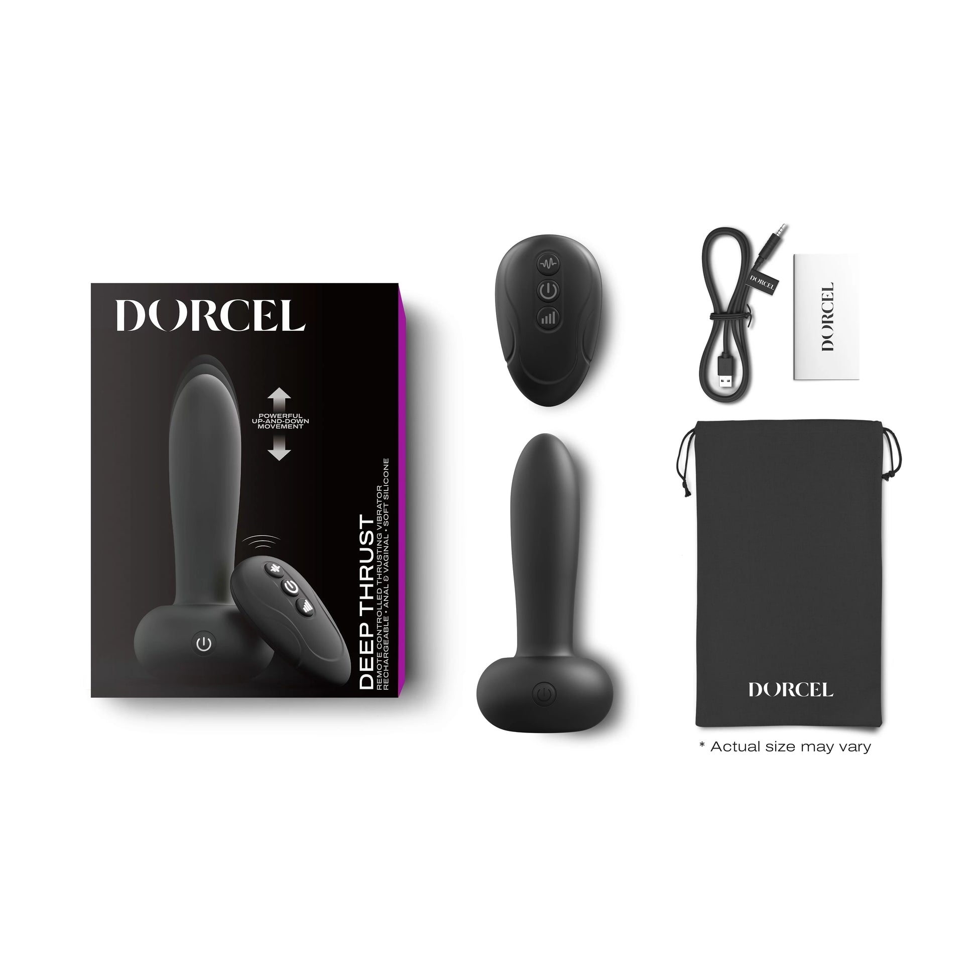 Ertu tilbúin að upplifa ferðalag af djúpum unaði og unaðslegum þrýstingi? Uppgötvaðu einstakan unað af segulmagnaða, fjarstýrða titraranum DEEP THRUST! Segulþrýstitæknin gerir titraranum kleift að hreyfa sig upp og niður án þess að það heyrist mikið í honum! býður upp á ekta tilfinningar með næi. Hvort sem þú kýst að nota hann í leggöng eða endaþarm þá býður ávali, kúlulaga endirinn upp á auðvelda og þægilega innsetningu ásamt því að veita góða fyllingu, Flati botninn tryggir örugga notkun í endaþarm.