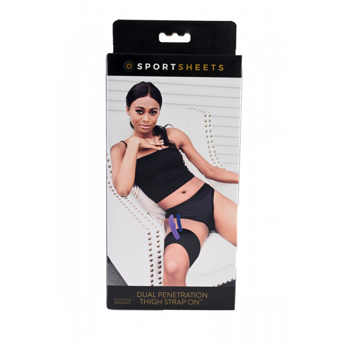 Double Penetration Strap-on belti frá Sportsheets sem festist á læri.