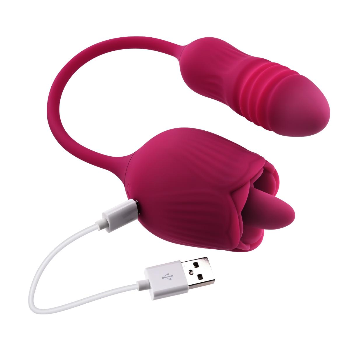 Villirósin frá Evolved er útbúin tungu sem hreyfist upp, niður og titrar... og er tilvalin til að örva snípinn. Síðan er rósin tengd við þrykkjandi titrara sem hægt er að nota í leggöng eða endaþarm. Tveir takkar og tveir mótorar tryggja að hægt sé að stjórna rósinni og bulletinu í sitthvoru lagi og finna stillinguna sem veitir þér mestan unað!