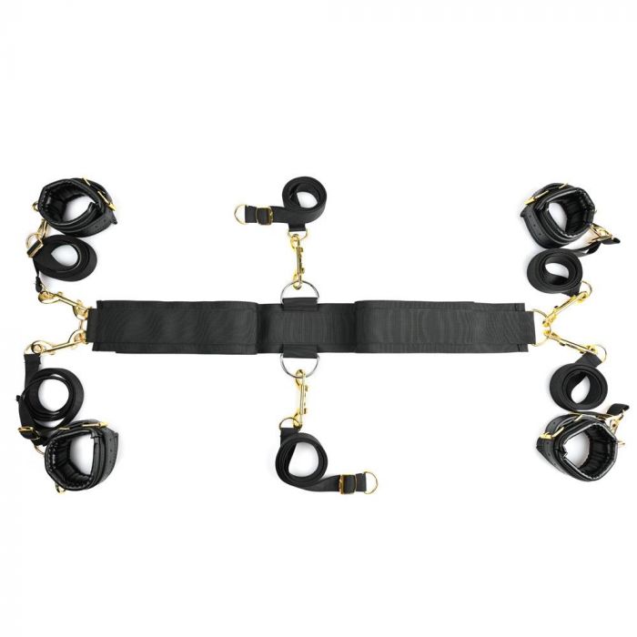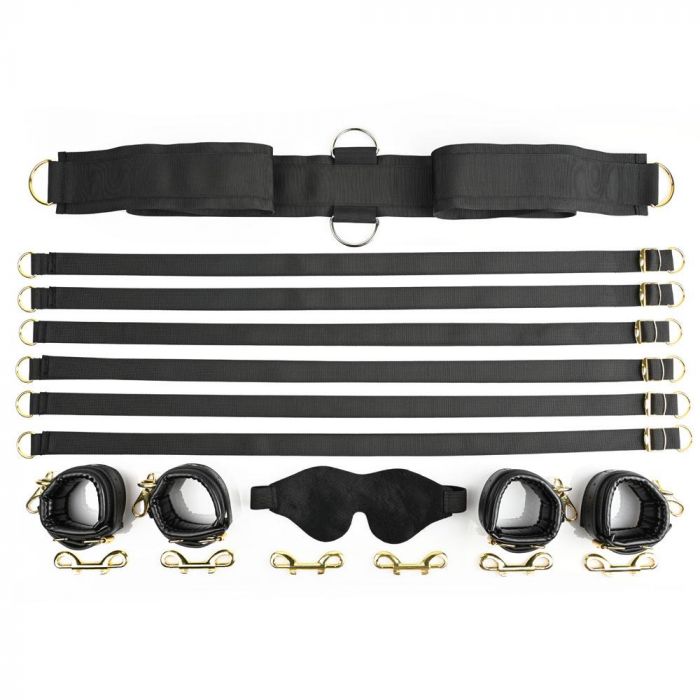 Settið inniheldur sterka ól sem heldur öllu saman, 6 aukaólar til að velja úr eða nota allar saman, handjárn, ökklajárn og mjúkt blindfold.