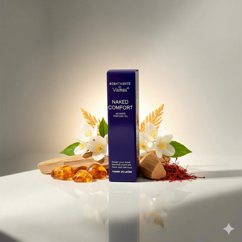 Viamax NKD Comfort er ilmvatnsolía fyrir öll kyn. Með fágaðri blöndu af amber, sedarviði, jasmín og saffron býr það til hlýja og lostafullan ilm sem dvelur með þér langt inní nóttina.