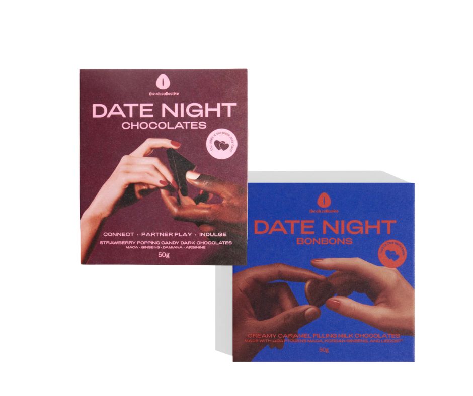 Eitt box af mjólkursúkkulaði molum með silkimjúkri karamellufyllingu, og eitt box af ríku, dökku súkkulaði með jarðarberjaskoti. Bæði blönduð með Maca og ginseng, en karamellu molarnir innihalda Liboost® — þéttduft af damiana fyrir aukna löngun og dýpri tengingu.