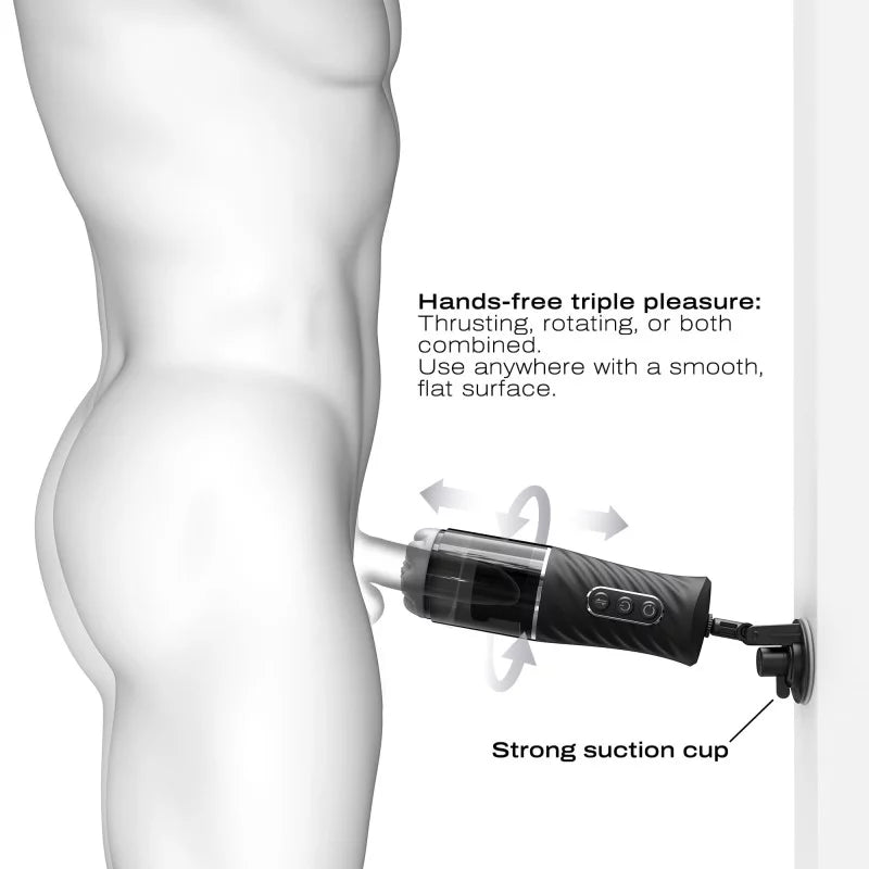 Sterka sogskálin gerir þér kleift að vera alveg handfrjáls og festist örugglega við slétt yfirborð svo þú getir slakað á og látið Thrust Blow Pro taka stjórn! Til að gera gott enn betra getur þú fest síman þinn við tækið með símafestingu sem er hönnuð fyrir bæði lárétta og lóðrétta sýn. Fjarlæganlega áferðahlífin bætir við þægindum og raunveruleika OG gerir þrif auðveldari!Slakaðu á, gefðu inn í ánægjuna og leyfðu hreyfingunni að taka við.