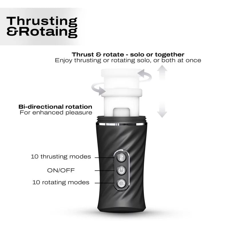 Thrust Blow Pro snýst allt um auðvelda notkun öflug afköst og algjöra ánægju. Notaðu þrýsting og snúning í sitt hvoru lagi eða á sama tíma fyrir sannarlega hugjúfa upplifun!